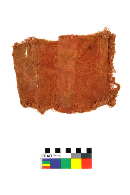 Fragmento textil rectangular irregular de color rojo anaranjado sin decoración. Contenía tierra colorada.