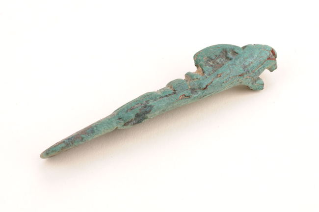 Adorno de uso personal utilizada como adorno para el cabello trenzado. Objeto oblongo con un extremo apuntado que representan una figura antropomorfa pequeña, de pie con los brazos en línea con el cuerpo. Elaborado en metal de color verde.