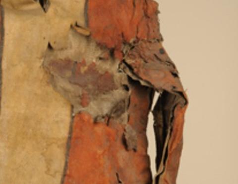Objeto utilizado como prenda de vestir para proteger el cuerpo. Coraza en forma de túnica que cubre el torso y los brazos. El cuerpo fue construido mediante la superposición de 7 capas de cuero cosidos con finas tiras de cuero, a la que se le agregaron mangas con el mismo sistema constructivo. El cuerpo y las mangas están coloreados de rojo, y en el cuerpo tiene una franja central vertical de color beige, que está delineada en el borde con color negro. Presenta abertura en ambos costados del cuerpo y en las puntas lleva unas borlas de cuero.