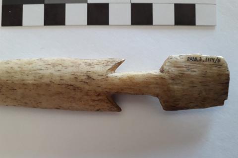 Objeto utilizado para cazar. Cabezal de arpón monodentado elaborado en hueso tallado de forma lanceolada con escotadura y protuberancia o pedúnculo cuadrangular en su base posiblemente para insertar en algún astil, es de color blanquecino natural. Tiene inscrito: “4326 MH 7” en tinta de color negro sobre color blanco y “2018.3.1114/5” en tinta de color negro sobre barniz transparente.