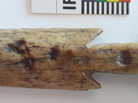 Objeto utilizado para cazar. Cabezal de arpón monodentado elaborado en hueso tallado de forma lanceolada con escotadura y protuberancia o pedúnculo cuadrangular aplanado en su base, posiblemente para insertar en algún astil, es de color blanquecino natural. En una de sus caras presenta algunas huellas y muescas atribuibles a decoraciones. Conserva una capa de pátina y huellas de uso.
