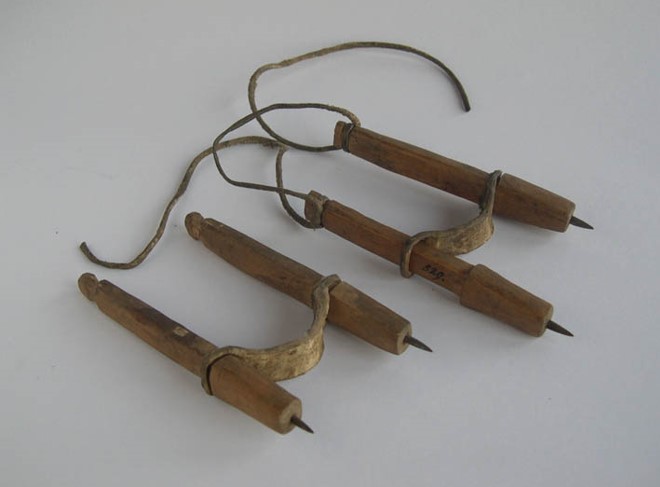 Par de espuelas para picar al caballo, se utilizan sujetas al tobillo del jinete. Cada espuela está construida con dos trozos de madera tallada, una tira de cuero rectangular y unas tiras más finas para atarlas al tobillo. Los cilindros de madera tienen rebajada en la parte superior formando un pedúnculo ovoide, donde se ata la fina tira de cuero y en la parte media del cilindro está rebajado originando una forma trapezoidal que se afina y termina recta. En esta parte inferior lleva inserto en la zona central un metal aguzado como púa para picar al animal. Estos dos trozos de madera van unidos por medio de una tira de cuero que tiene una perforación en cada extremo por donde atraviesa cada cilindro y baja hasta la parte trapezoidal. Solo una de las espuelas conserva la fina tira de cuero para atar. Y cada espuela lleva inscrito respectivamente el número “5711a” y “5711b” escrito en color negro, y en ambas, el número “529” escrito en color negro.