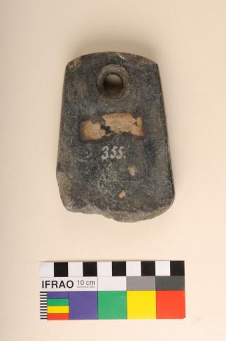 De forma trapezoidal alargada. El lado superior tiene sus esquinas redondeadas y presenta una perforación de contorno circular la cual atraviesa el material, mientras que el lado opuesto es irregular por fractura.