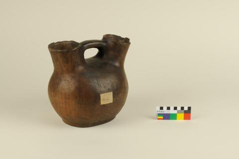 Con cuello doble de tipo hiperboloide con borde evertido, los que están unidos por un asa tipo puente, con cuerpo globular de base plana.