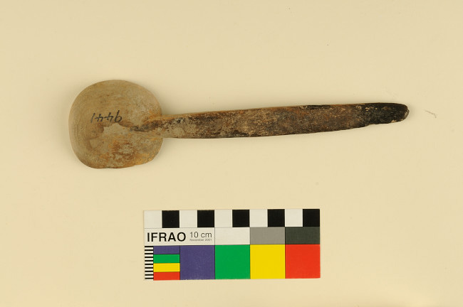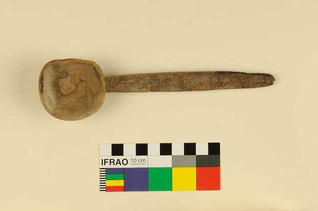 Objeto de madera de cuerpo oblongo conformado por una sección lenticular cóncava a fin de generar un espacio de receptáculo o cuenco, el que se encuentra unido a una sección cilíndrica la cual actua como mango y termina levemente aguzada.