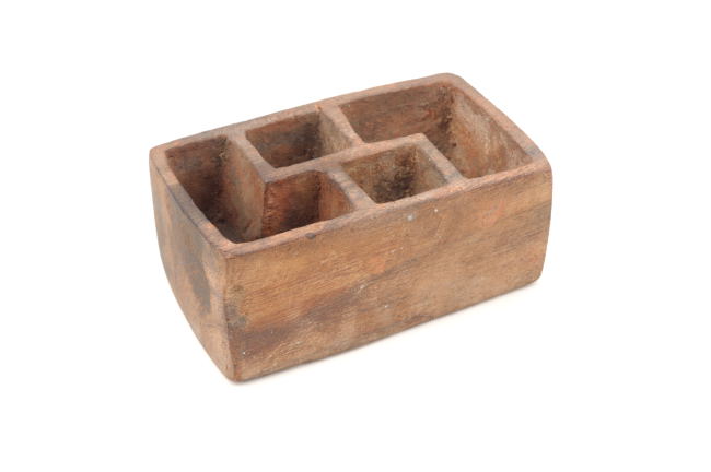Contenedor de madera de formato rectangular sin tapa, el cual cuenta con cuatro compartimentos a los que se accede desde la parte superior.