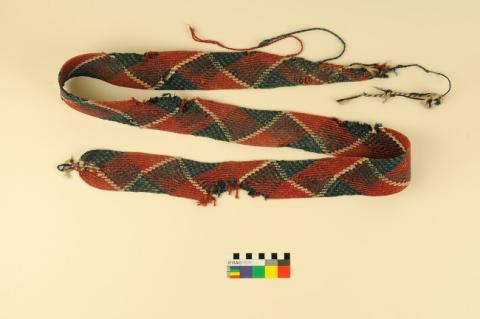 Objeto de lana tejida en forma rectangular, uno de sus extremos distales es curvo mientras que el opuesto es apuntado y con algunas hebras largas colgantes. La prenda es de color rojo y verde y con una línea zigzag de color blanco por todo su largo.