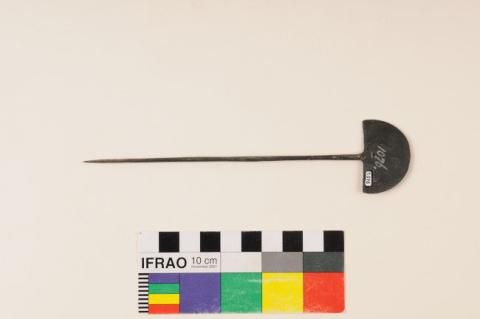 Adorno de uso personal. Objeto de cuerpo oblongo de sección plana elaborado en metal. Se compone por una lámina metálica en forma de medio circulo la cual se encuentra unida a una sección cilíndrica alargada terminada en una punta aguzada. En la zona de unión de ambas partes la lámina presenta una perforación circular. Ambas caras son lisas y sin adorno.