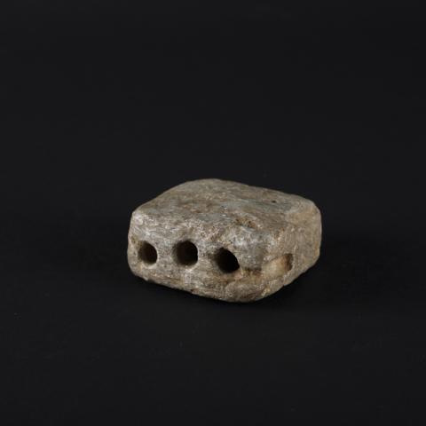 Su cuerpo asemeja a una forma cuadrangular, con su cara superior levemente de mayor extensión que la inferior y con tres horadaciones de tipo cilíndrico y de distintas longitudes.