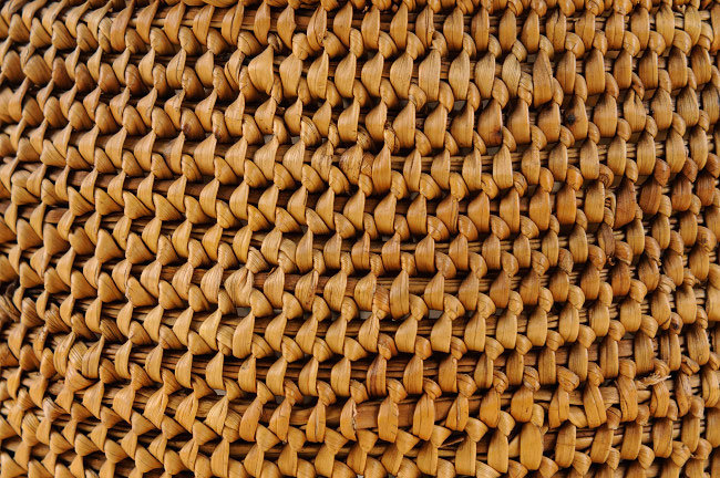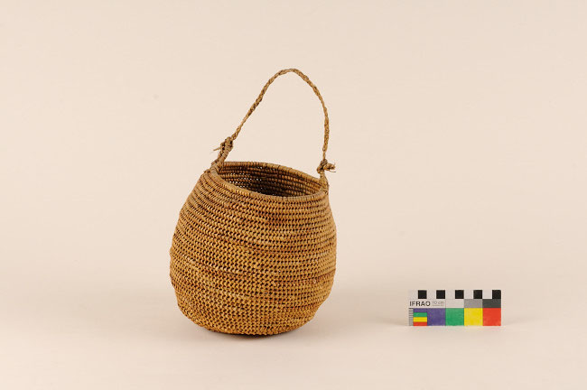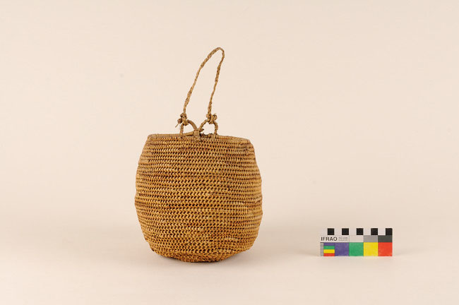 Objeto de uso doméstico. Contenedor restringido de cuerpo ovalado y base plana. Presenta dos ojales del mismo material parcialmente embarrilados y atados un cordel de fibra trenzada. Tejido en espiral con fibra de origen vegetal de color marrón.