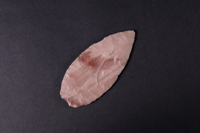 Objeto de uso ritual y/o doméstico obtenido mediante tallado sobre piedra. De forma lanceolada, de bordes curvos con extremo distal apuntado. Presenta ambos bordes aserrados y base levemente cóncava. De color rosa con manchas rojas.