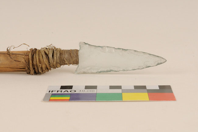 Instrumento utilizado para cazar conformado por punta y asta. Punta triangular bifacial de bordes rectos tallada en material de vidrio translúcido unida por su pedúnculo y embarrilada mediante cordones de diferente espesor a asta de madera de sección circular y base apuntada.