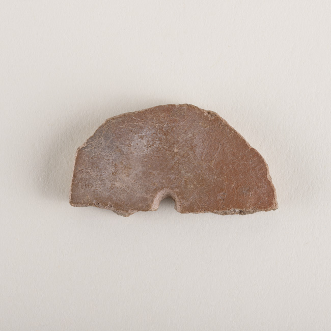 Instrumento cerámico con forma de disco y perforación central transversal usado en conjunto con el huso de hilar. Pieza corresponde a media porción de disco, superficie pulida en ambas caras.