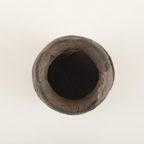 Contenedor restringido de perfil compuesto. Cuerpo hiperboloide y cuello troncocónico de borde evertido. Labio redondeado y base plana. Presenta cambio de coloración entre cuerpo y cuello. Superficie marrón pulida.