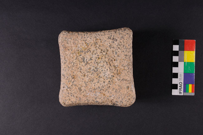 Objeto labrado en piedra de forma paralelepípeda, de esquinas y vértices redondeados y caras angostadas. La piedra es de color anaranjado con inclusiones negras. Una de sus caras presenta coloración central circular de color más claro.