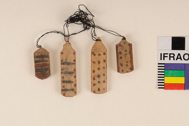 Objeto decorativo conformado por cuatro piezas rectangulares de madera unidas por hilo de color negro. Presentan decoración pintada en colores negro y rojo en ambas caras.
