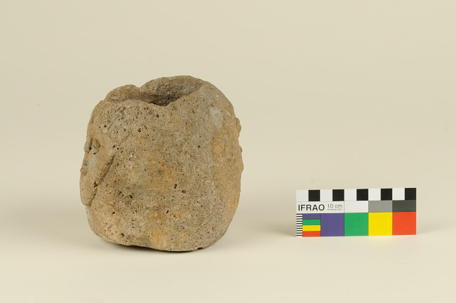 Recipiente de piedra, cuerpo cilíndrico de paredes anchas y base plana, color marrón grisáceo. Superficie tallada con doble representación de rostro en lados contrarios.