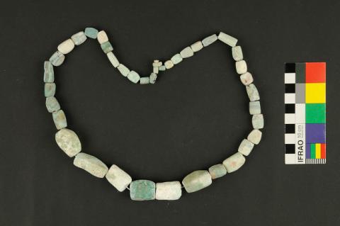 Objetos de uso decorativo. Collar y brazalete confeccionados a partir de malaquita, de cuarenta y veinte cuentas respectivamente unidas por cuerda anudada. Cuentas semi tubulares pulidas en tamaño creciente hacia la parte inferior.