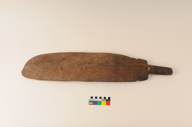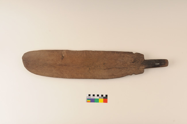De cuerpo oblongo, elaborado en madera tallada en forma de tablón o paleta rectangular y con sus bordes redondeados. En su extremo distal presenta un apéndice rectangular o mango.