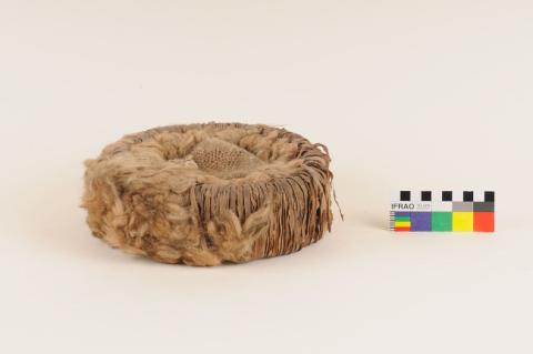 Pieza de cuerpo anular la cual tiene una estructura interior elaborada en fibra de lana tejida de forma semiesférica, la cual esta cubierta en su contorno por cintas de fibra vegetal dispuestas verticalmente. En la parte superior se observan adiciones de piel de animal.