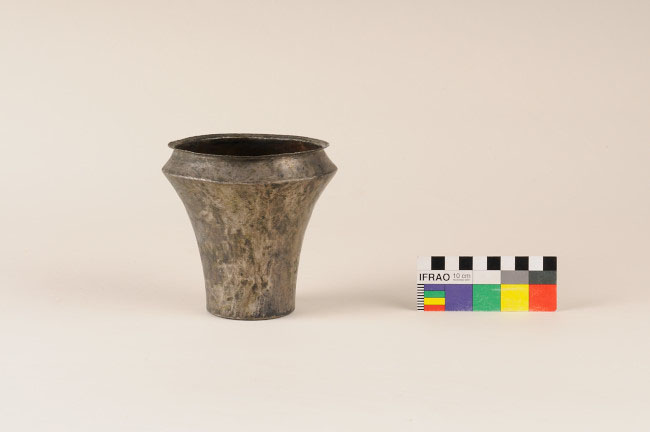 Objeto elaborado en metal de aspecto simétrico no restringido y de perfil compuesto con sus puntos de inflexión definidos. De borde evertido con labio plano y cuerpo tronco cónico invertido de base plana. De terminación pulida.