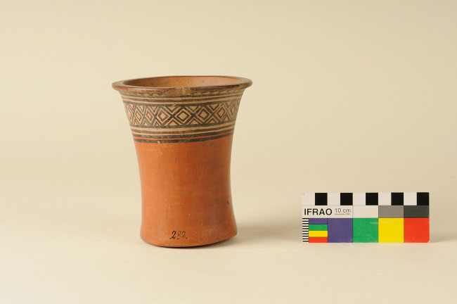 Contenedor de forma no restringida y de perfil simple. De borde evertido con labio plano y cuerpo tronco cónico invertido de base plana. El objeto está elaborado en cerámica y presenta decoración pintada en su tercio superior en forma de banda de color blanco sobre la que se disponen rombos en hileras color café dispuestos de modo horizontal entre líneas rectas del mismo color.