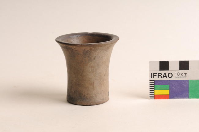 Contenedor de forma no restringida y de perfil simple. De borde evertido con labio plano y cuerpo tronco cónico invertido de base plana. El objeto está elaborado en cerámica, de terminación lisa y sin decoración.