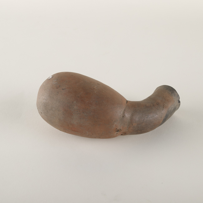 Contenedor cerámico fitomorfo de cuerpo elipsoide alargado que se prolonga en un cuello largo, estrecho y curvado con terminación en borde irregular de sección circular.