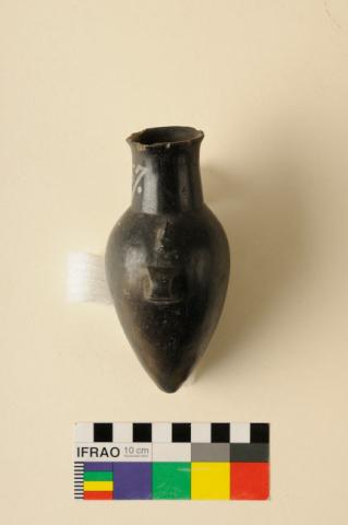 De cuello hiperboloide de borde evertido y labio irregular por fractura. De cuerpo globular y con base aguzada. Presenta dos asas verticales tipo cinta ubicadas en la zona del cuerpo.