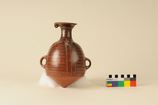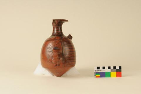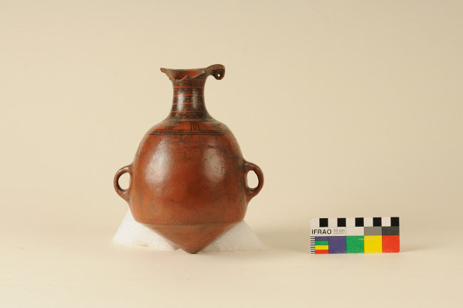 De borde evertido y labio recto, de cuerpo globular. Presenta dos asas verticales tipo cinta ubicadas en la zona baja del cuerpo.
