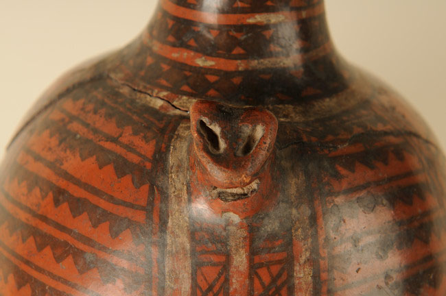 Presenta decoración donde se encuentra un campos de diseño en el cuello con triángulos invertidos, luego otro campo que cubre la mitad del cuerpo con similar motivo en translación vertical y bandas con clepsidras e hileras de líneas horizontales intercaladas. Presenta también un modelado en el sector superior de la vasija.