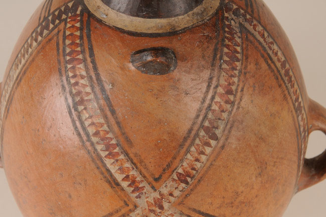 Su superficie exterior presenta decoración pintada en forma de franjas horizontales de color blanco sobre negro en el cuello, mientras que en el cuerpo presenta cuatro campos triangulares dispuestos por una de sus caras, los que se delimitan por una cinta blanca dispuesta entre dos líneas de color marrón.