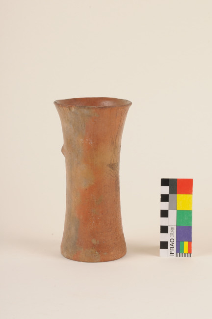 Contenedor abierto de cuerpo hiperboloide y base plana. Presenta decoración pintada en sector medio y superior en color negro sobre anaranjado, con diseño de chevrón, triangulo relleno y lineas quebradas. Tiene un mamelón en el tercio superior.