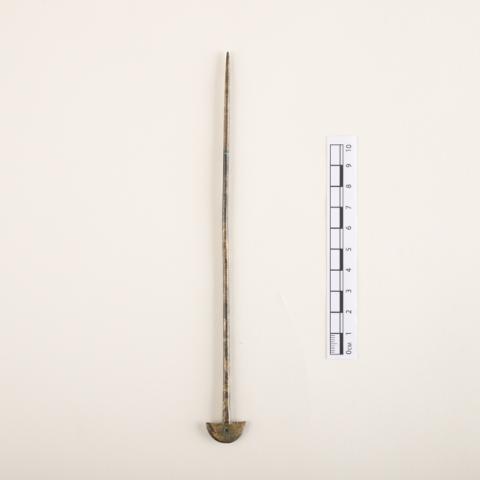 Adorno de uso personal. Objeto de cuerpo oblongo de sección plana elaborado en metal. El objeto se compone por una lámina en forma de media luna y un cilindro alargado de extemo aguzado. En la zona de unión de ambas partes la lámina presenta una perforación circular. Ambas caras son lisas.