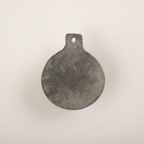 Instrumento decorativo de forma circular de sección plana con una proyección rectangular en el borde superior con orificio circular en el centro. Elaborado en metal fundido y laminado de color verde con manchas marrón.