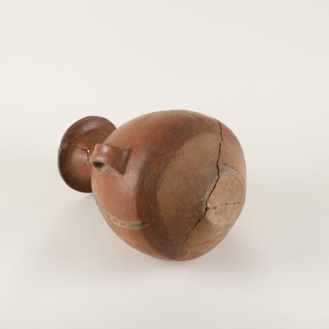 Contenedor restringido de perfil compuesto. Cuerpo globular de base apuntada de terminación plana, cuello largo y gran borde evertido. Presenta dos asas verticales de sección rectangular y superficie pintada en dos bandas convergentes en unión cuerpo-cuello con motivo lineal en color blanco sobre engobe rojo.