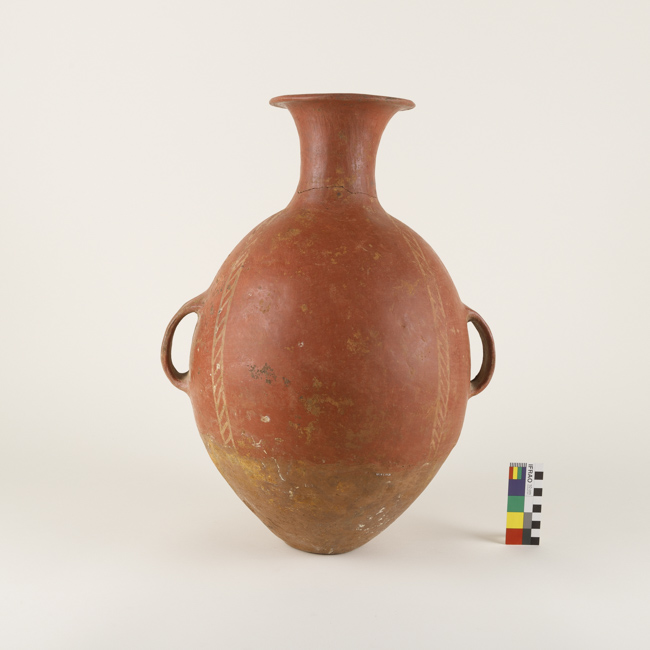 Contenedor restringido de perfil compuesto. Cuerpo ovoidal de base apuntada de terminación plana, cuello largo y borde evertido. Presenta dos asas verticales y superficie pintada en dos bandas que rodean verticalmente cada asa con motivo en líneas diagonales. En color blanco sobre engobe rojo.