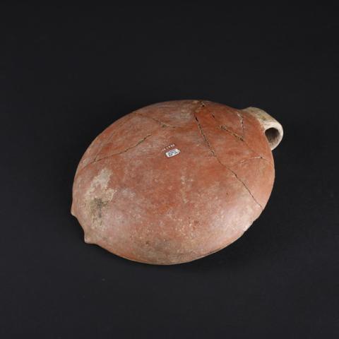 Recipiente cerámico abierto, cuerpo hemisférico y base plana. Decoración modelada con dos protúberos y asa vertical curva en lado contrario. Interior blanco con decoración en pintura roja a partir de dos bandas con motivos de secuencia de grecas. Exterior de color rojo.