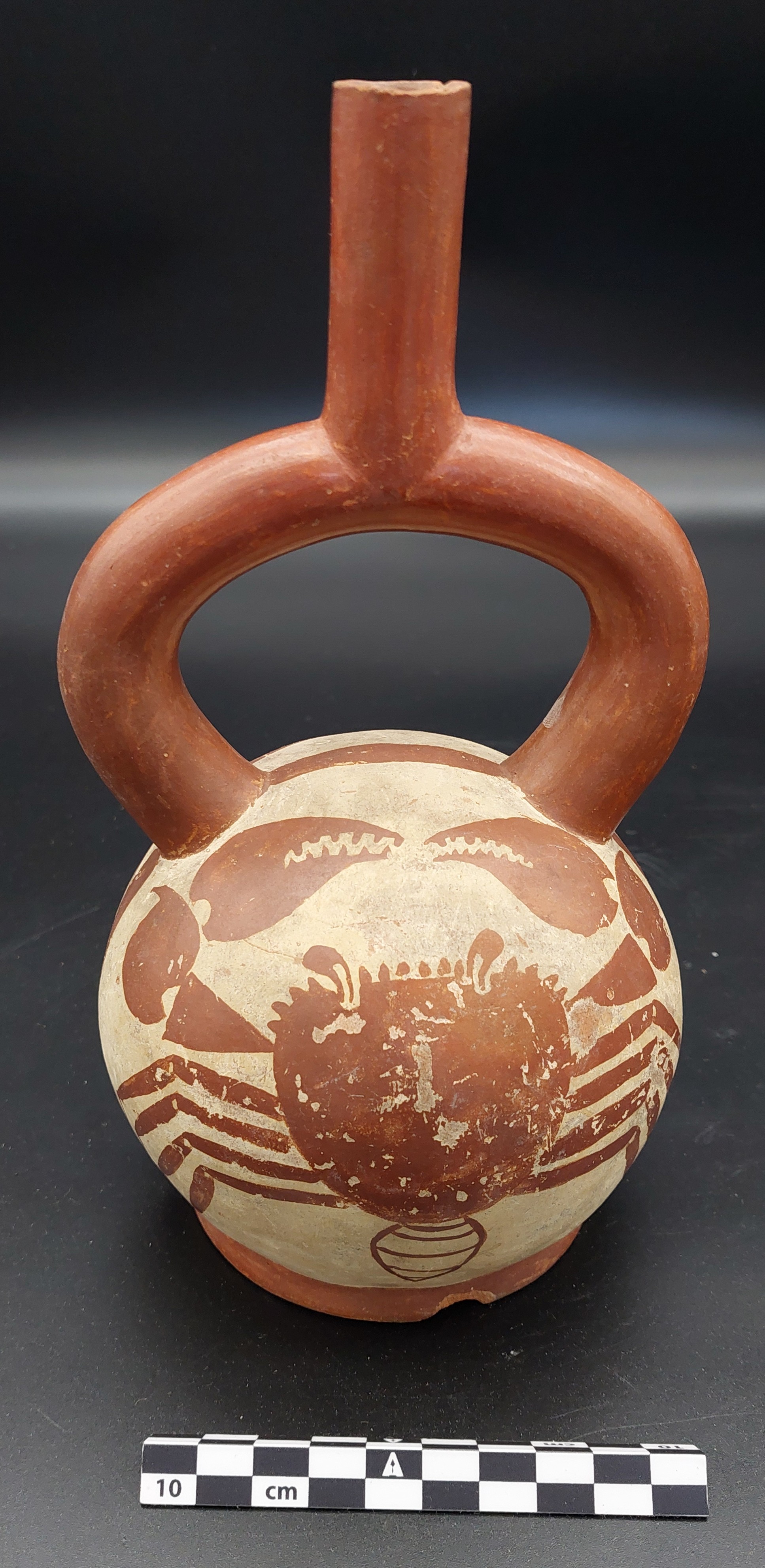 Recipiente restringido de perfil compuesto, cuerpo globular, con cuello recto y cilíndrico, conectado por asa estribo, de base cóncava. La superficie está decorada con la representación pintada de un cangrejo, en color rojo sobre fondo blanco. Tiene inscrito en la base “308”, “17”, “685”.