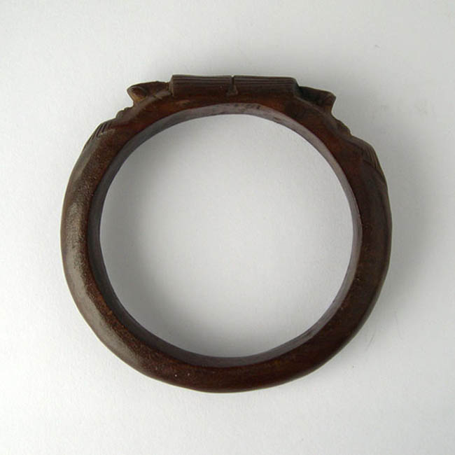 Aro usado como adorno que se lleva en las muñecas, de madera tallado y finamente pulido. Está decorado con dos cabezas antropomorfas opuestas por su parte posterior. Las cabezas tienen el peinado y la barba dibujado con líneas incisas.