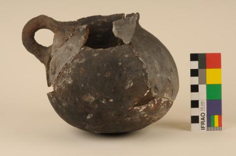 Vasija restringida asimétrica de cuerpo semiglobular con insinuación de cuello y un asa vertical en la parte posterior que va desde el borde al cuerpo.Superficie extrena alisada y ahumada. Fragmentada con partes faltantes, ha sido restaurada.