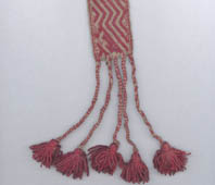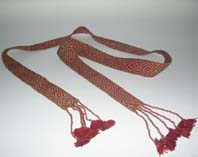 Faja textil de fondo blanco con dibujos de rombos concéntricos, los mayores unidos por un vértice, de color rojo (dos tonalidades). Los espacios entre ellos y las orillas se completan con medios rombos concéntricos. Los extremos se completan con cinco cordones con borlas de color rojo.