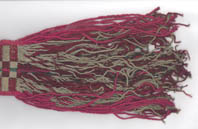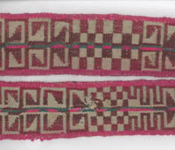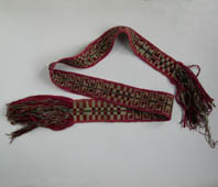 Faja tejida en tela decorada en color rojo oscuro flanqueado con rojo claro; se distinguen en ella doce campos dispuestos de la siguiente manera desde un extremo: un campo ajedrezado, un campo de espirales rectos; un campo ajedrezado; un campo de grecas; un campo de espirales.
