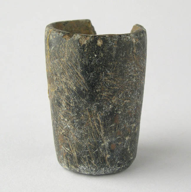 Recipiente de piedra,, cilíndrico de base plana, color jaspeado negro a gris blanquesino. Superficie pulida.