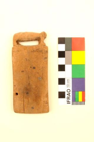 Objeto rectangular de madera tallada. En el área central presenta cavidad siguiendo la forma. En el extremo superior figura zoomorfa tallada. Posiblemente felino.