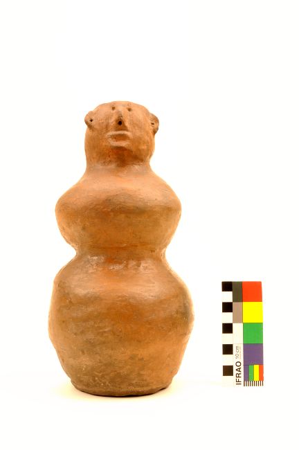 Ceramio globular doble simétrico. De construcción irregular, el globulo inferior de base plana posee mayor diámetro que el globulo superior el que termina en una cabeza antropomorfa a modo de cuello. Asa vertical labio-globulo superior. Superficie marrón pulida.