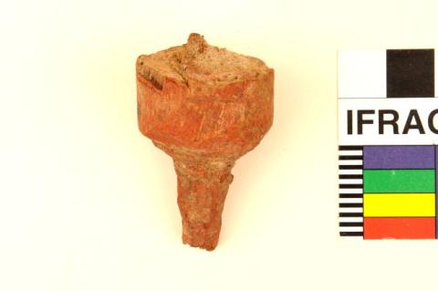 Objeto de madera compuesto por una sección cilíndrica con uno de sus lados planos y el otro con terminación tubular alargada desde el centro.