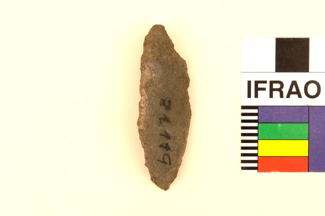 Pieza lítica oblonga gris. Ambos extremos aguzados. Una cara plana. Bordes con trabajo de tallado.