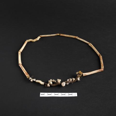 Objeto de uso decorativo conformado por diez segmentos de hueso largo agrupados mediante hilo de color marrón. En zona inferior otro segmento de hueso se intercala a una veintena de conchas de caracol de color blanco, las que se atan entre sí y al hilo mediante lana de color marrón.