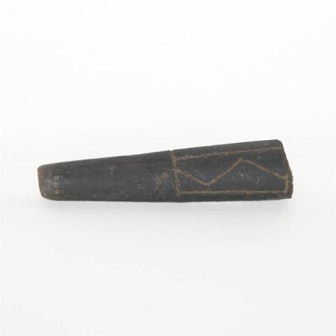 Parte de un utensilio para fumar. Fabricado en cerámica. Tamaño pequeño, con forma de tubo cónico, es decir, que se adelgaza en uno de sus extremos, el interior se encuentra tapado con tierra. Color negro. Decoración incisa lineal formada por un rectángulo que en su interior tiene dos líneas paralelas y en los lados opuestos líneas en zigzag.